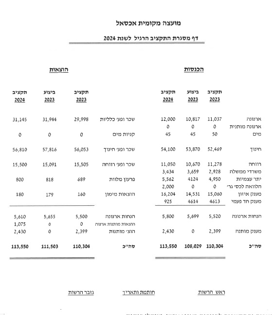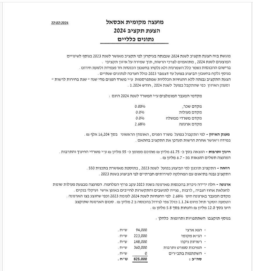 اقترح الرئيس المصادقة على اقتراح الميزانية العادية لسنة 2024 والتي تشمل قرض مبلغ 2 مليون شاقل ,